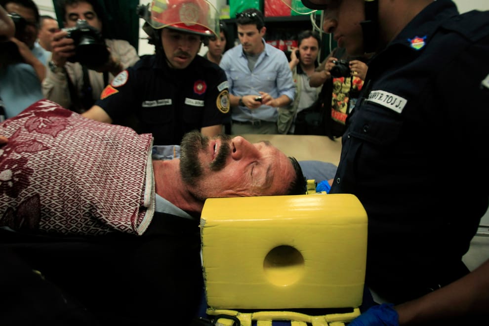 麥克菲坦言,他在貝里斯涉嫌買兇殺人,潛逃至瓜地馬拉後佯裝心臟病發,隨即被引渡回美國。圖為當時他佯裝心臟病發的畫面。