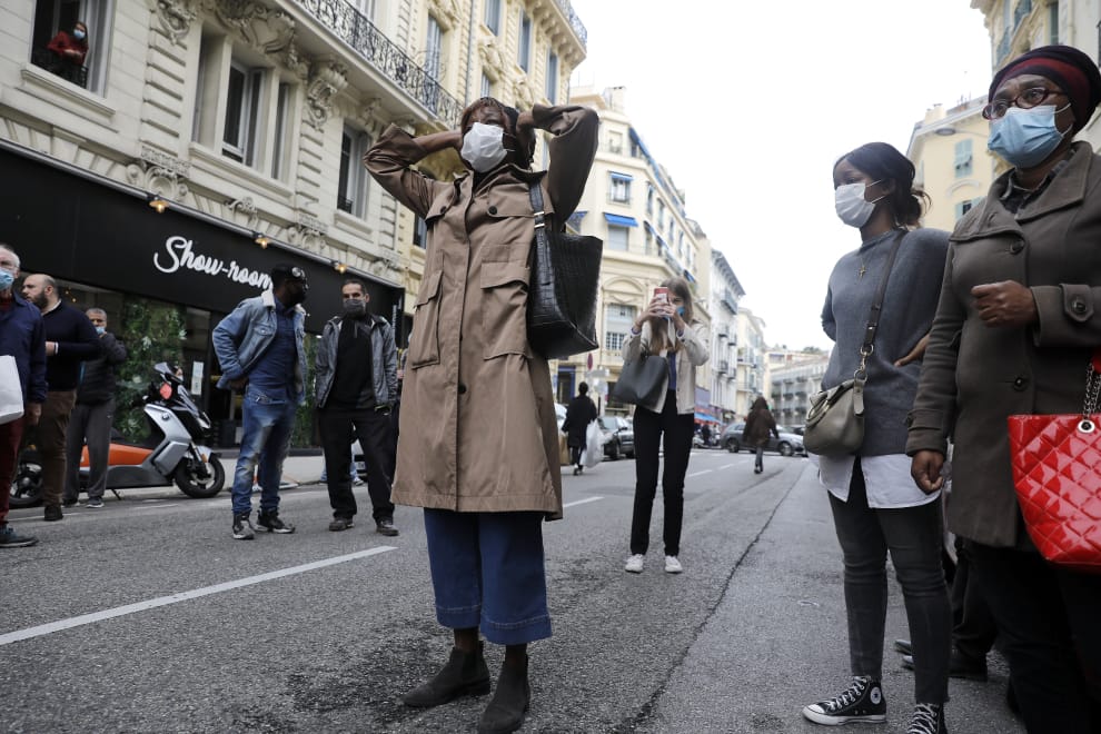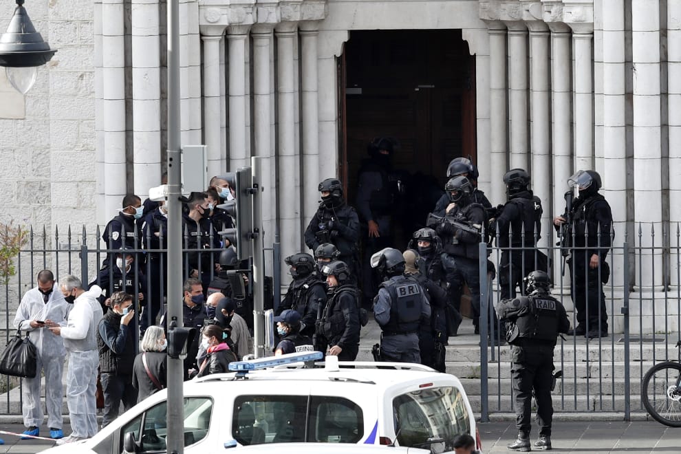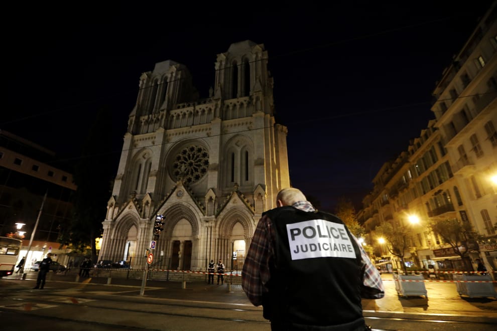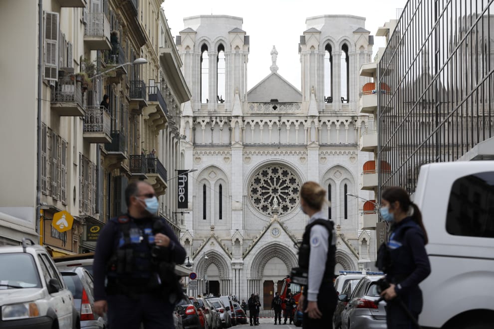周四(29)早上 9點,位於法國尼斯(Nice)的聖母大教堂遭到恐怖攻擊,兇嫌進入教堂後,率先持刀攻擊一名 55歲的男性教堂工作人員,隨後轉而攻擊另外兩名女性,總共造成三人死亡。其中,受害的 60歲女性遭兇嫌割喉近乎斬首,另一名 44歲的女性跑到附近的咖啡館求援後,傷重不治身亡。