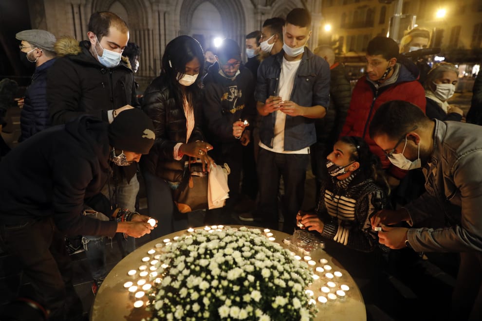 29號晚間,人們來到尼斯聖母大教堂附近,替亡者守夜哀悼。