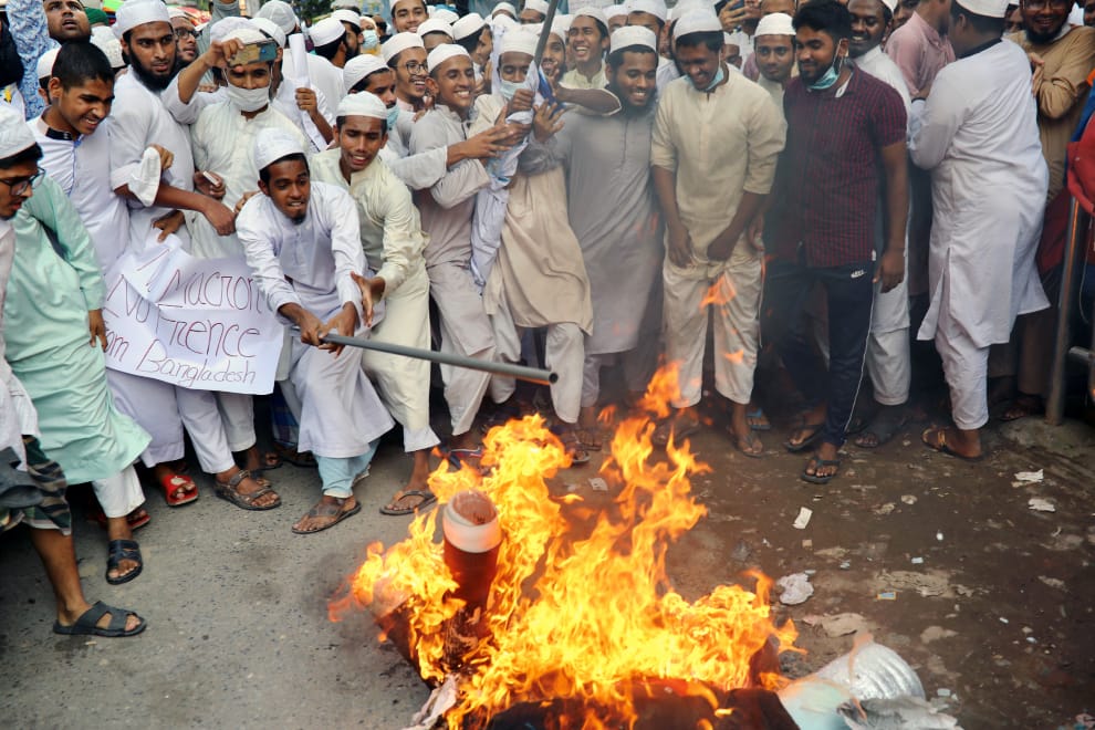 近日,法國總統馬克宏誓言對抗伊斯蘭極端主義的言行,引發海內外穆斯林的不滿。在孟加拉的首都達卡,民眾將法國總統馬克宏的人偶焚毀洩憤。