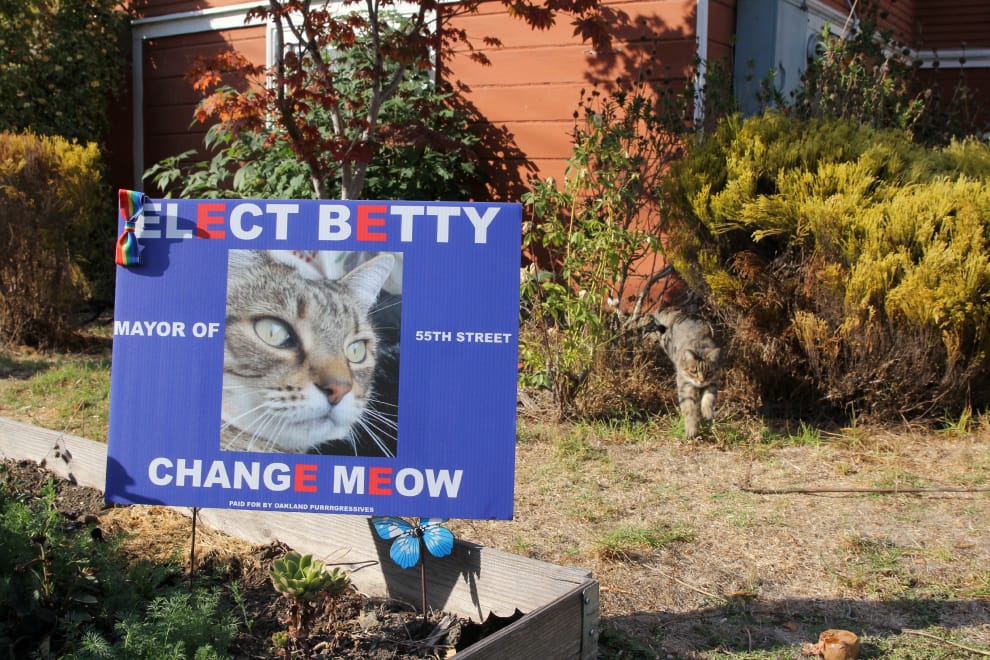 「我不是說愛競爭或什麼的,只是你看米米這麼可愛、大家也都知道牠,而且候選人不應該只有貓嘛,」米米的主人歐文(Mary Owen)說:「這裡可是奧克蘭——我們接受所有人。」