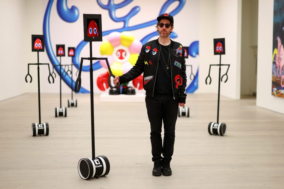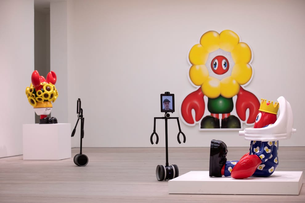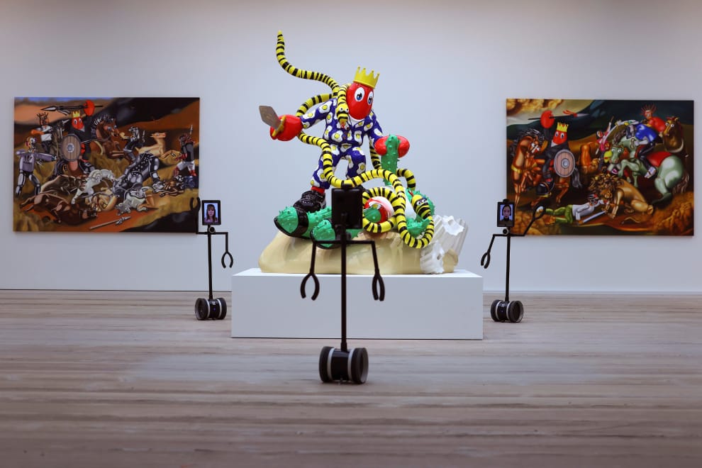 上周四(29),英國普普藝術家考爾伯特(Philip Colbert)的藝術作品在倫敦薩奇畫廊(Saatchi gallery)展出,除了一些看展的民眾以外,還可以看到配有鏡頭、平板、遙控輪子的遠端機器人。