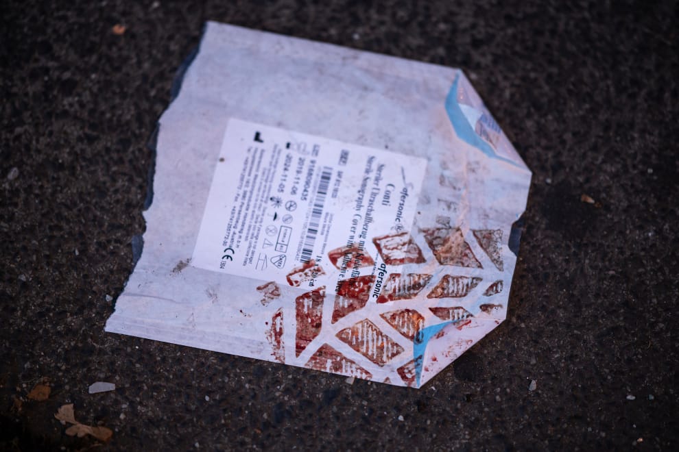 在案發現場附近,攝影師發現一張還留著血腳印的包裝紙,足以想見費祖萊行兇當下眾人倉皇逃命的情景。