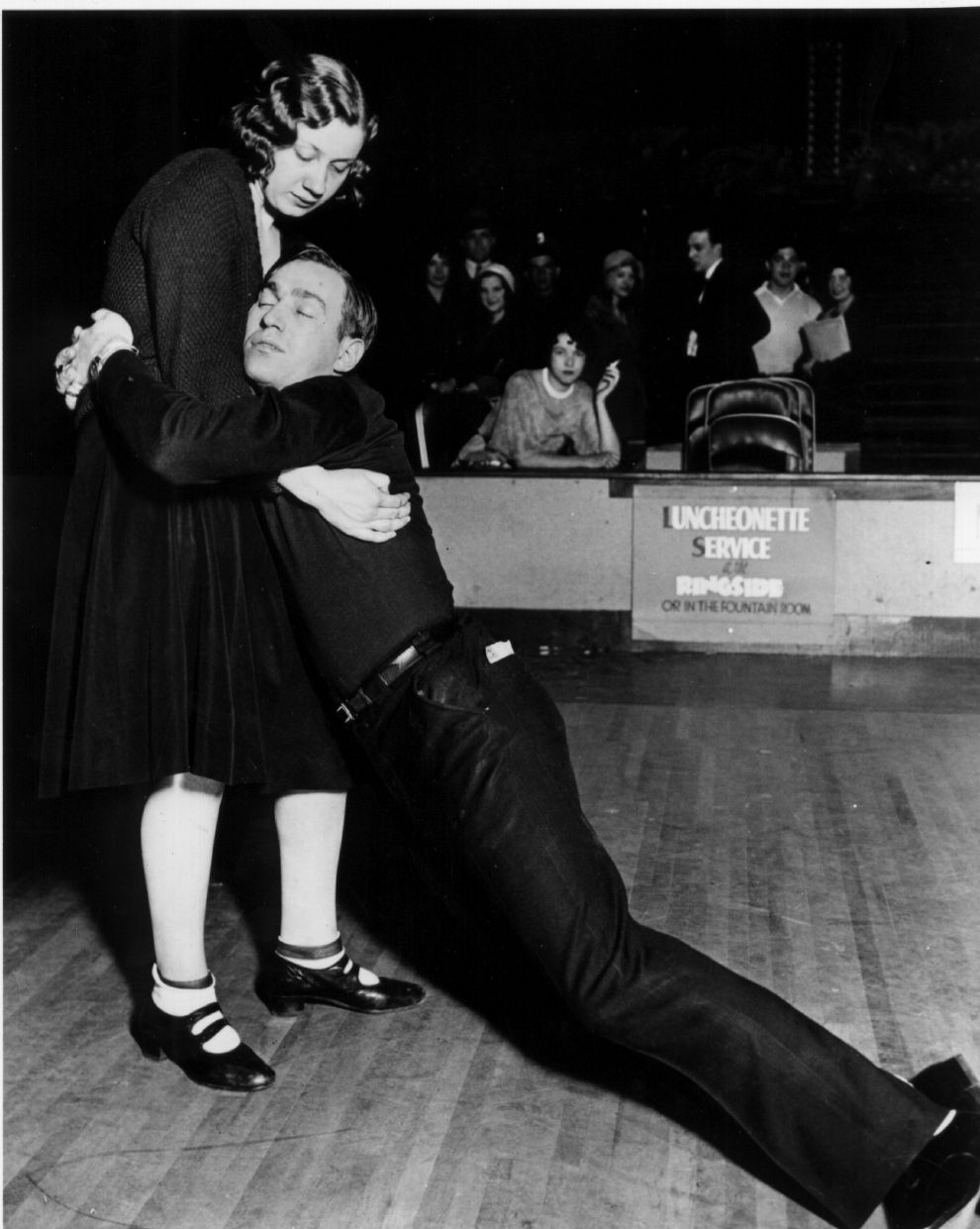 1930年,在美國芝加哥市舉辦的一場跳舞馬拉松活動上,舞者拉瓦尼克(Ann Lawanick)費力地支撐她精疲力盡的舞伴里托夫(Jack Ritof)。