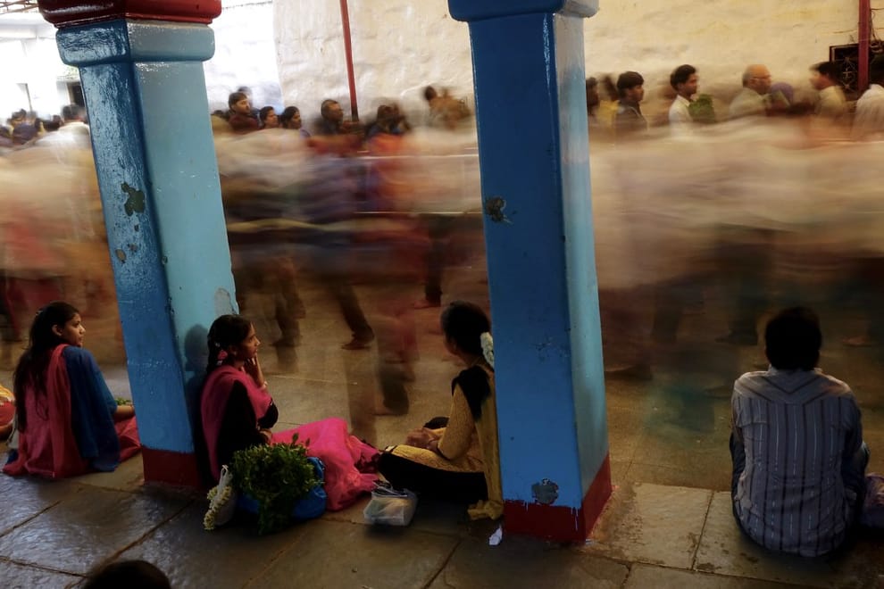 在巴拉吉神廟內,人們坐在廊下看著絡繹不絕的參拜人潮。然而因為疫情的關係,目前巴拉吉神廟暫時關閉中。