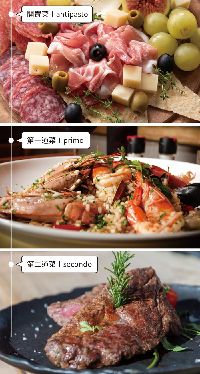 接下來也會有至少兩種第一道菜來增加整體菜色的豐富性,菜色也會從口味淡吃到口味較重的,好讓每道菜的味道都能充分被品嘗,平常家庭的晚餐便不會這麼大費周章。第一道菜用完後,深盤收走,留下淺盤來吃第二道菜(secondo),通常會是魚、肉類等主餐,這才是整個晚餐的重頭戲,最後是水果或是甜點來為晚餐收尾。