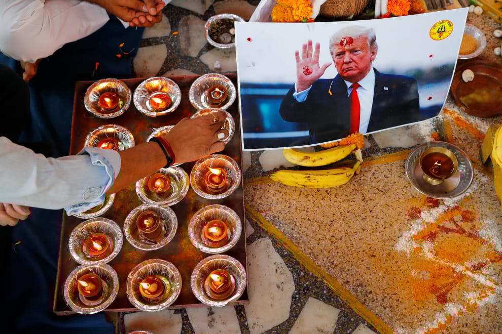 在兩組候選人選情膠著的時刻,川普、賀錦麗在印度的粉絲們各自舉辦祈福法會,希望他們所支持的候選人能成為最終贏家。圖為印度當地的川普支持者,正在舉行一場祈福法會,替川普的選情祈福。