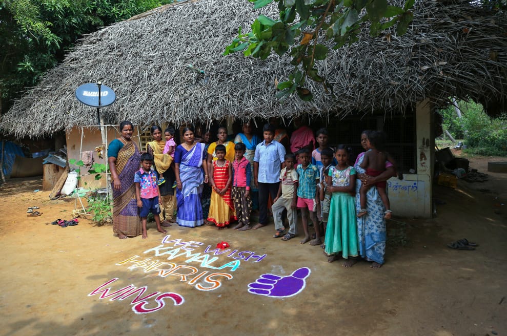 在選情膠著的時刻走進圖拉森小鎮,處處都能嗅到濃濃的美國大選氣息。鎮上一處泥地寫著一組彩色標語「我們想要賀錦麗勝選」(We Wish Kamala Harris Wins);小鎮四處都是賀錦麗的大幅海報,還有人做了多幅「從圖拉森到美國」(From Thulasendrapuram to America)的標語,掛在鎮上的各個角落。