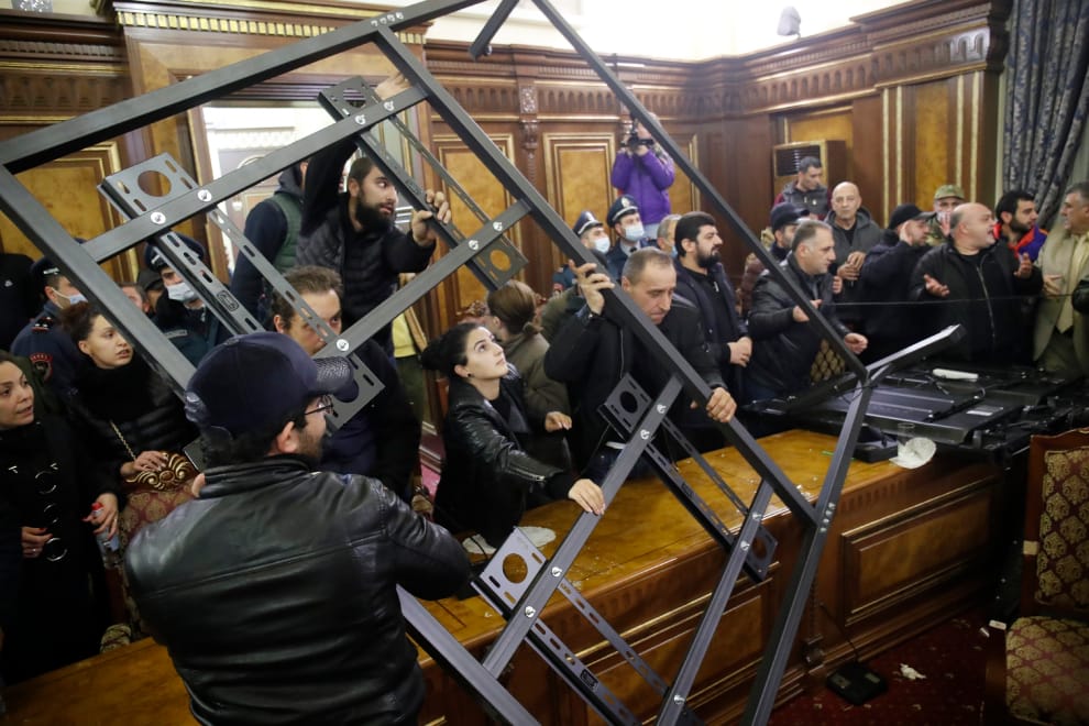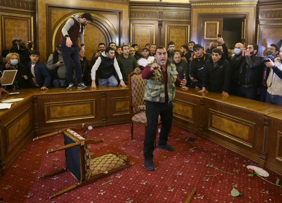 當天晚上,數百位憤怒的示威者衝進國會、亞美尼亞總理帕希尼揚的住所和其他政府大樓,很多人高喊著「帕希尼揚在哪?那個叛徒在哪裡?」,打算找他出來算帳;意外被捲進衝突的國會議長米爾佐揚(Ararat Mirzoyan)被憤怒的群眾毆打,最終送進醫院緊急治療。