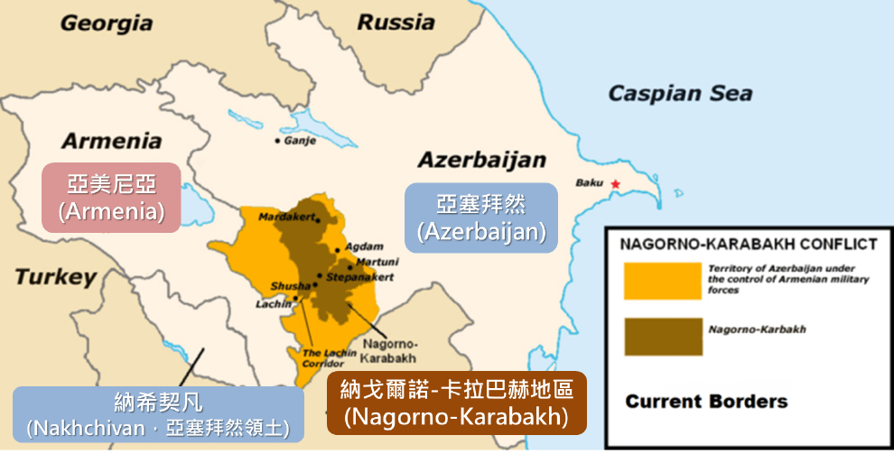 圖為亞塞拜然、亞美尼亞兩國及周遭地區的示意圖,兩國中間深咖啡色的土地,即為雙方數度交戰的導火線卡拉巴赫地區,左下角則是亞塞拜然的飛地納希契凡。