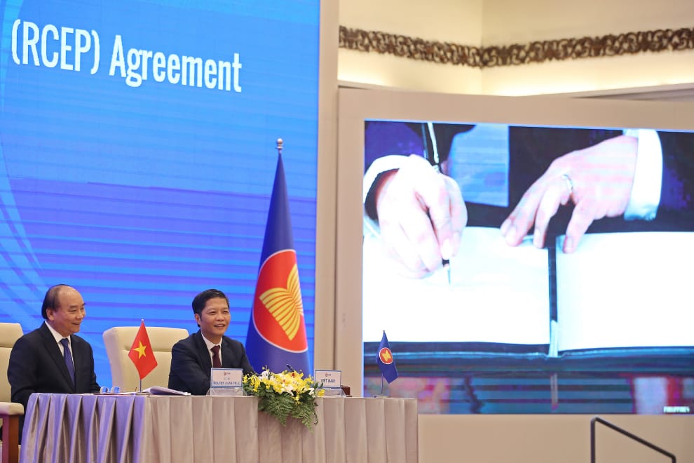 現在,各國準備將簽署好的RCEP拿回國內批准,預計在兩年內就能正式上路生效。圖為在越南河內和各國連線直播簽署儀式的越南總理阮春福(左)和商務部長陳俊英(右)。