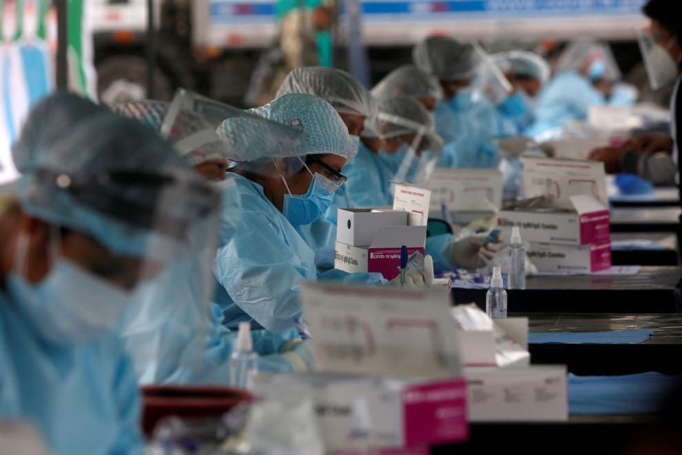 在秘魯一處臨時成立的COVID-19(武漢肺炎)篩檢中心內,醫護人員一字排開,準備替民眾篩檢。