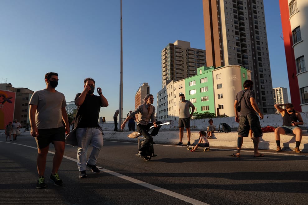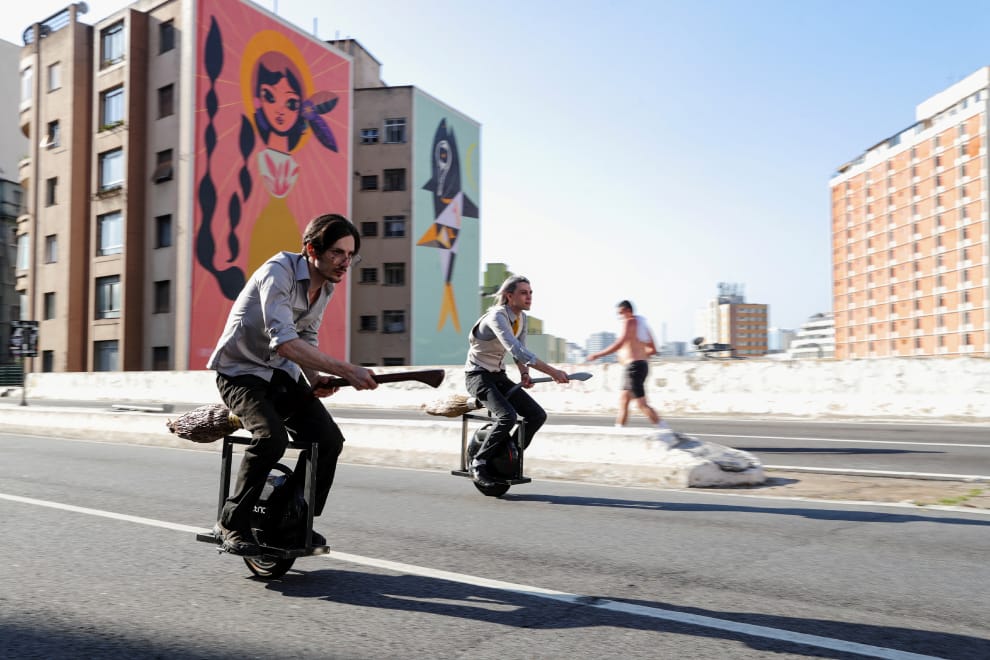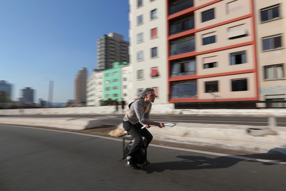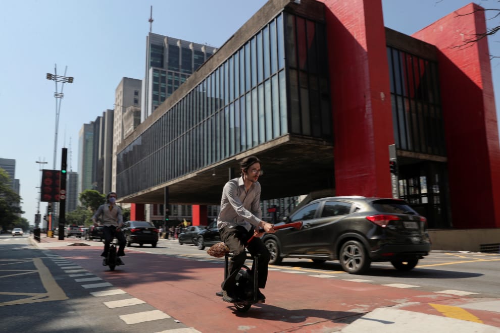 在巴西聖保羅街頭,發明家聖克圖斯和魯索騎著他們的得意之作──掃帚電動單輪車。