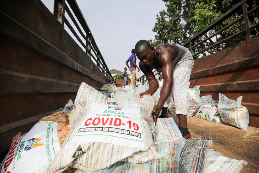 COVID-19(武漢肺炎)的出現,讓奈及利亞原本就出現的食物危機雪上加霜。圖為正將一袋袋稻米搬上車的工作人員,他們準備將這些稻米送去給受到疫情影響的人。