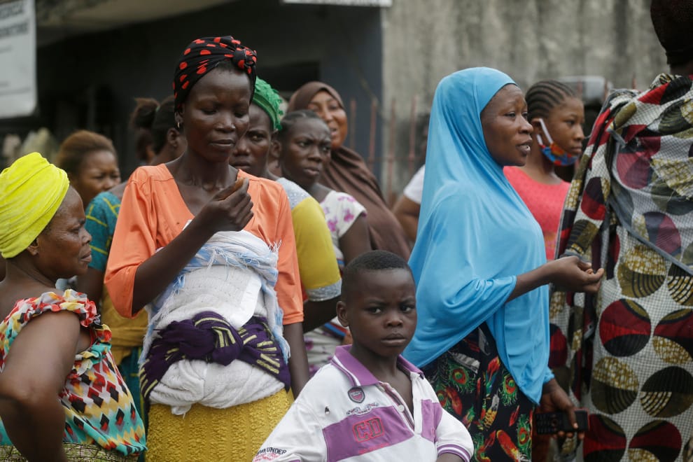 2020年4月25日,來自拉哥斯馬可可貧民窟(Makoko slum)的婦女和小孩,正在排隊領取紅十字會發放的救濟食物。