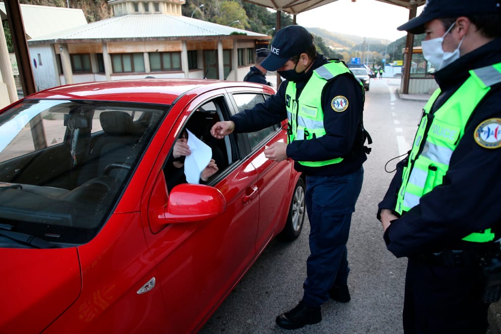 為了出門,民眾在聲明書上填寫的離家事由百百款,其中不乏令人啼笑皆非的理由。圖為在法國和西班牙邊界值勤的法國邊界警察。