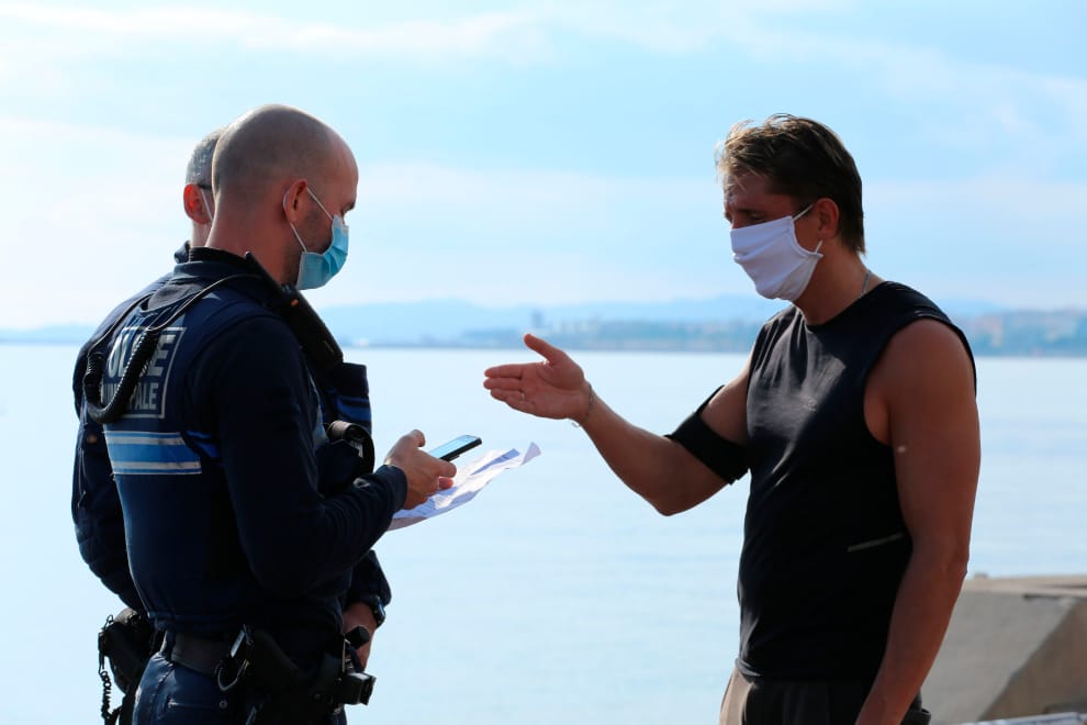 在法國南方城市尼斯(Nice),一名男子(非此案當事人)正在跟警察解釋他在防疫封鎖令下離家的理由。