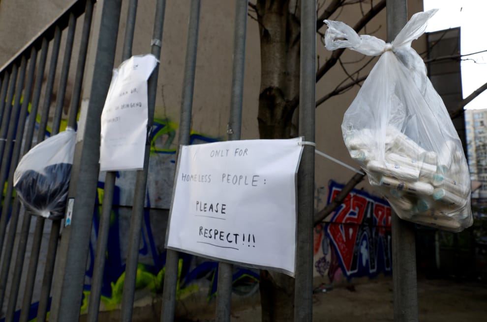 「月經貧窮」的現象隨處可見,圖為在柏林一處遊民聚集地,掛有一袋給遊民免費拿取的衛生棉條。