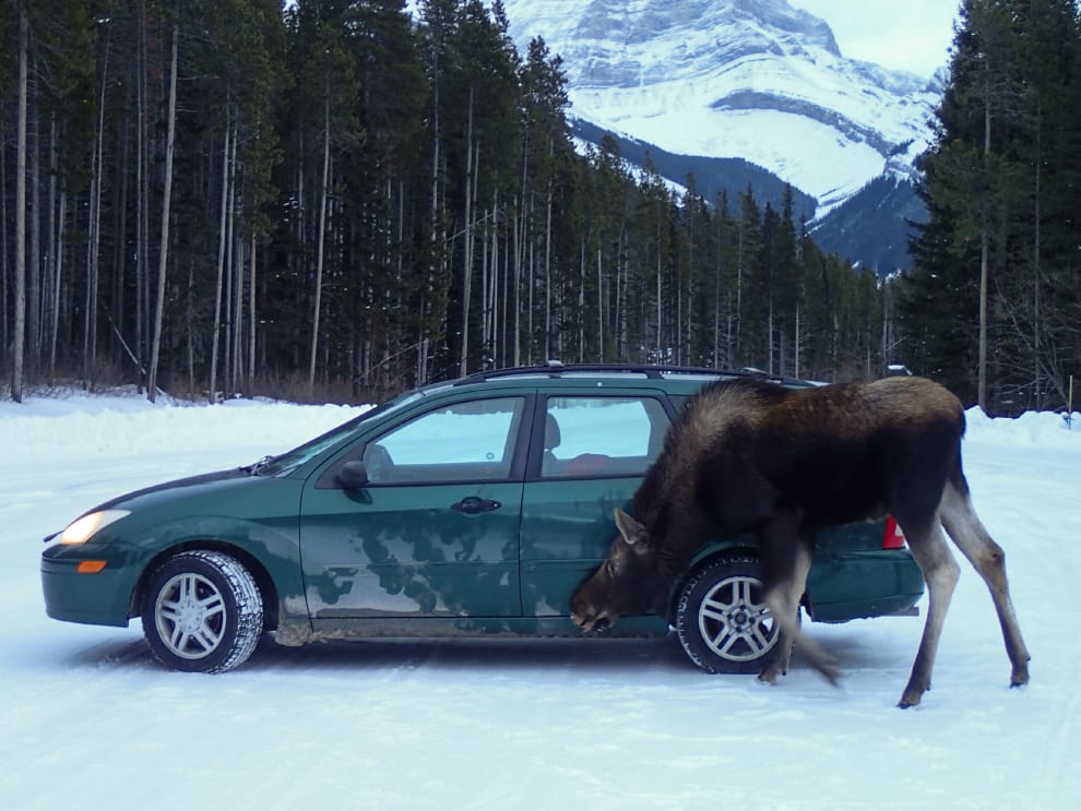 只要有遊客,駝鹿的願望通常不會落空,特別是許多好奇的觀光客看到駝鹿後常常會停下車來靜靜觀察,此時這些遊客們開的車便成為駝鹿眼裡的最佳目標。