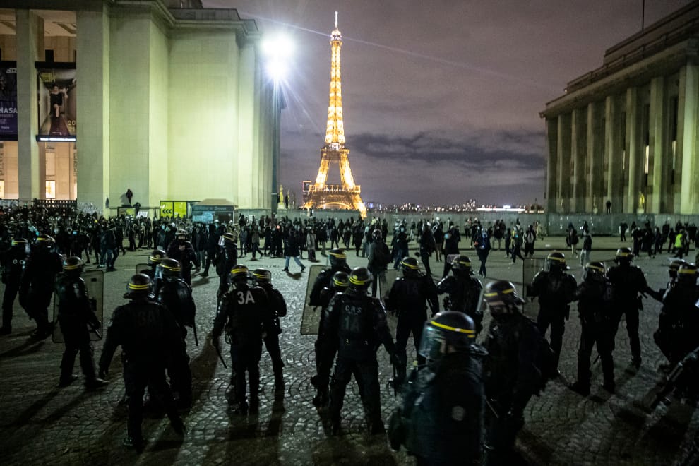 在法案通過前夕,一大群鎮暴警察在法國巴黎鐵塔附近聚集,準備要應對屆時可能失控的示威場面。