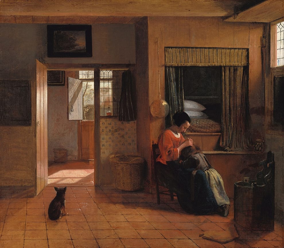 在這幅 17世紀荷蘭畫家霍赫(Pieter de Hooch)的作品《母親的責任》(A Mother's Duty)中,可以看到畫作的右上方正是箱型床。