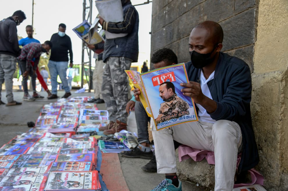 11月7日這天,在衣索比亞首都阿迪斯阿貝巴,一名男子正在看封面印著衣索比亞總理阿比照片的新聞雜誌。