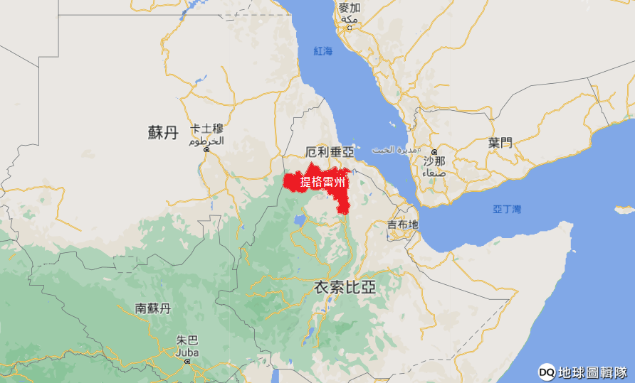 圖中紅色區域,即為位於衣索比亞北部的提格雷州,該州與蘇丹和厄利垂亞接壤,一直以來都由「提格雷人民解放陣線」執政。
