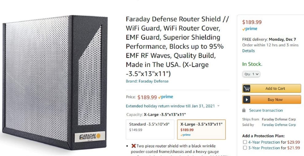 廠商宣稱這是針對路由器尺寸設計的法拉第籠,把路由器放在裡面,就可有效遮蔽電磁波、輻射等帶來的傷害,讓你從此健康的生活。但要獲得健康生活是有代價的,一個法拉第籠路由器遮罩要價 190 美元,將近台幣 5,500 元。但是,嘿!你得到健康,這才是最重要的,對吧?(圖片來源:亞馬遜)
