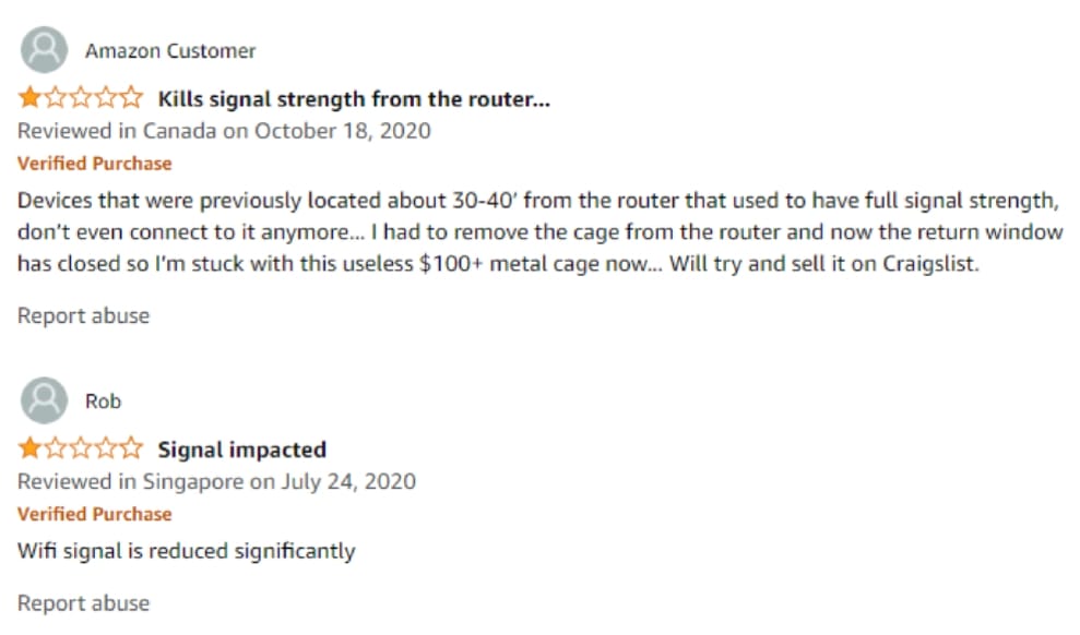有位加拿大用戶 10 月 18 日留言:「自從幫路由器加裝籠子之後,幾乎所有裝置都不能上網了。」嗯……不過,這正是法拉第籠的效果啊?(圖片來源:亞馬遜)