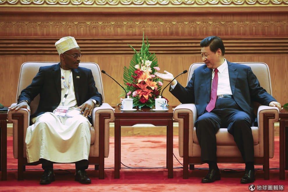 照片中是非洲葛摩(Comoros)的副總統莫哈地吉(Fouad Mohadji),他正與中國領導人習近平說話。