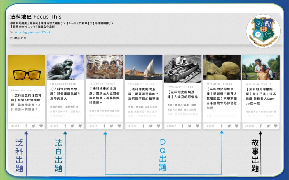 今年,從愚人節「沒有要開課的法科地史知識課」拉響第一炮,我們和《故事:寫給所有人的歷史》、《法律白話文運動》、《泛科學》合作,由各品牌輪流出題,大家依題目寫文章的企劃。