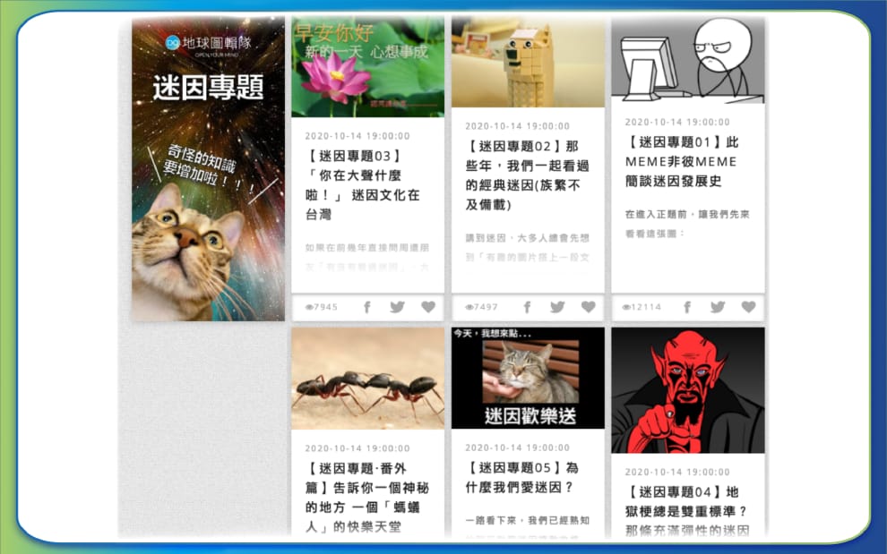 沒錯!今年地球圖輯隊帶來了史上最大自產專題:【奇怪的知識增加了!迷因是什麼,可以吃嗎?】,裡面結合種種資料和訪談,帶大家一窺迷因之所以迷人的秘密,以及它和網路生態緊密糾纏的關係,希望看完能讓你大喊出:奇怪的知識增加啦=◉Δ◉=!