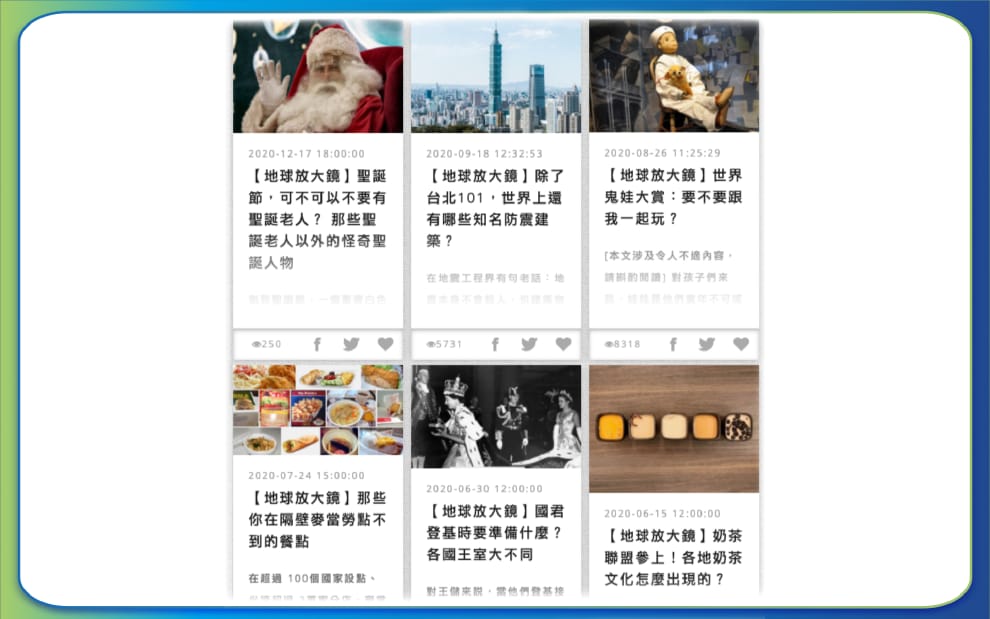除了迷因專題,今年下半年,小隊長不定時推出「一主題,多重滋味」的地球放大鏡系列,專門鎖定有趣的人事時地物,要讓大家看看世界各地的不同在哪裡。