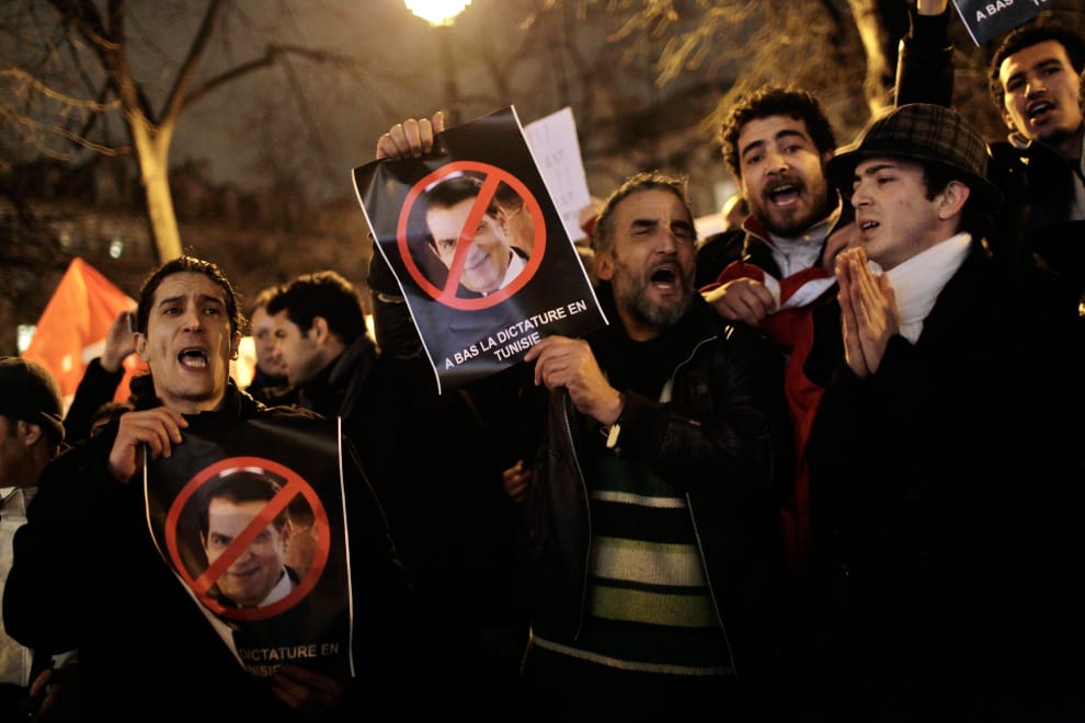 2011年1月6日,民眾在法國巴黎街頭支持突尼西亞推翻獨裁總統阿里。幾天後,眼見大勢已去的阿里逃到沙烏地阿拉伯,並在去年於沙國過世。