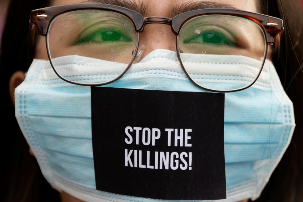 關於菲律賓警察濫權殺人的事件層出不窮,今年六月,在奎松市(Quezon City)舉辦的一場抗議活動上,一名女子戴上寫有「停止殺人」標語的口罩示威。