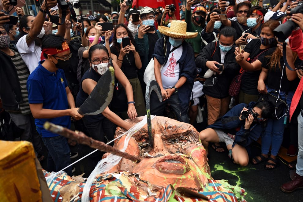 在今年 12月10日國際人權日這一天,民眾上街摧毀菲律賓總統杜特蒂的人偶,抗議他在毒品戰中放任惡警橫行、侵犯人權。