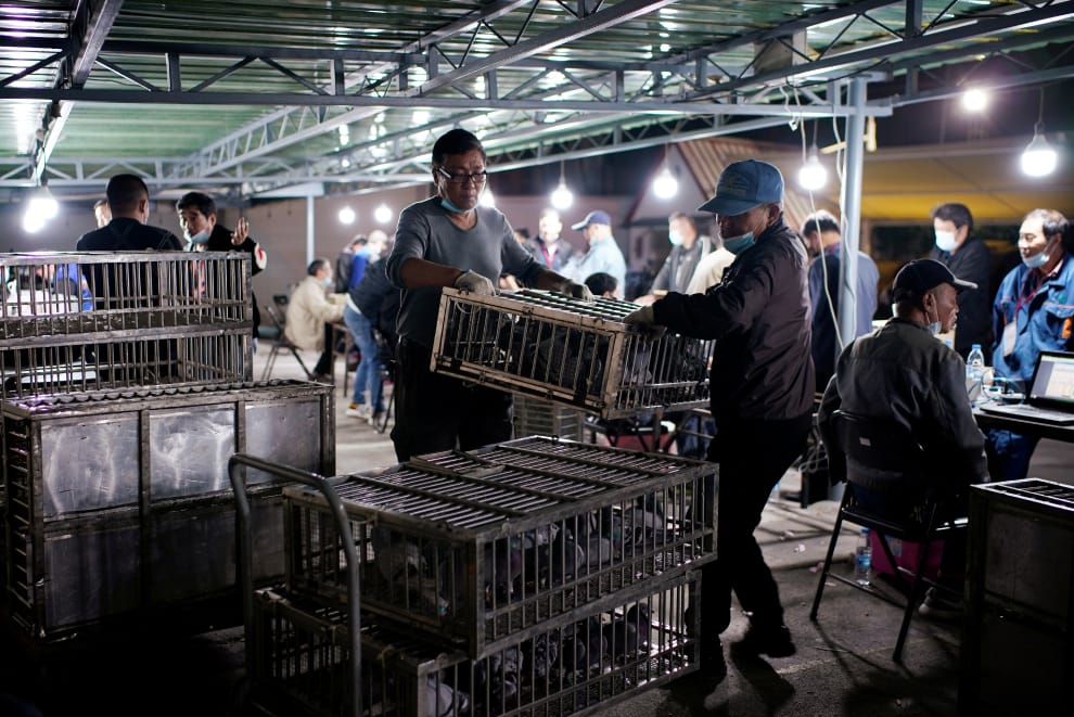 在北京今年十一月舉辦的賽鴿拍賣會上,養鴿人輪流端詳一隻賽鴿,決定要不要將牠帶回家。