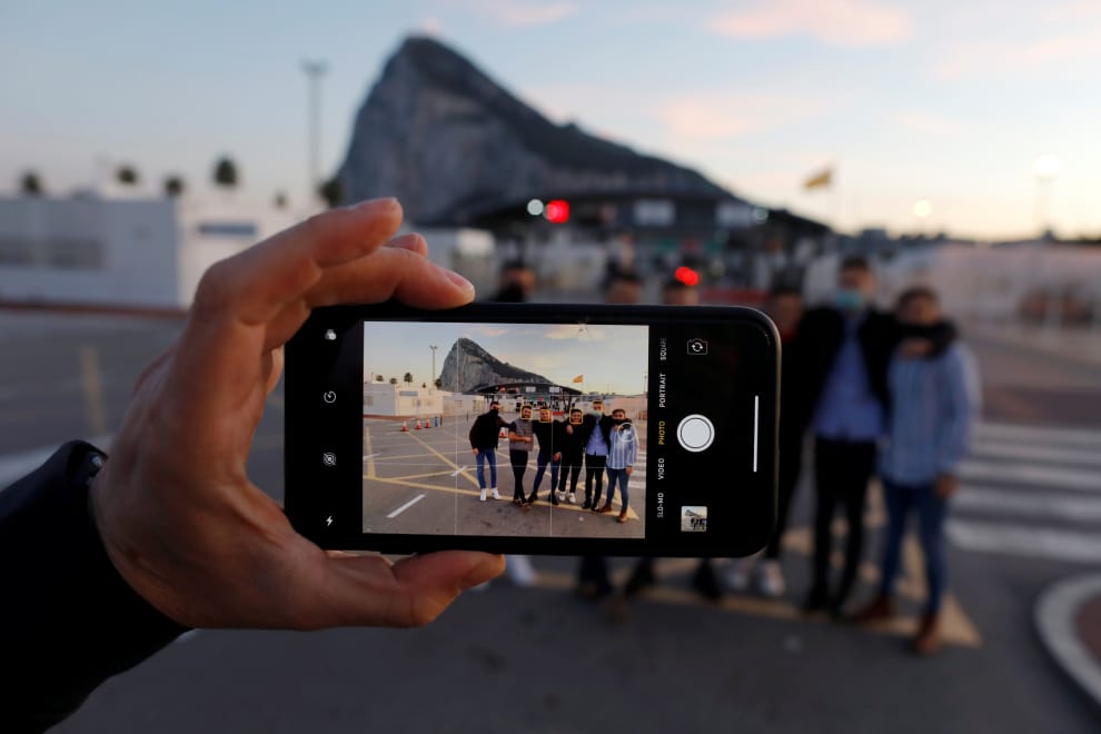在位於伊比利半島西南部、緊鄰西班牙城鎮的英國最小海外領地直布羅陀(Gibraltar),一群居民在西班牙慶祝完聖誕夜後,回到直布羅陀巨岩前留影。