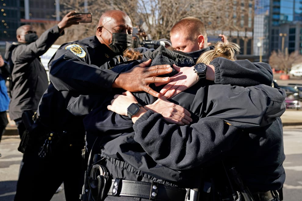 路透社 / 達志影像案發後,部分警察抱在一塊,慶賀彼此平安無事。當時多虧有他們挨家挨戶的敲門、提醒民眾盡速避難,這才避免大量傷亡的慘劇。