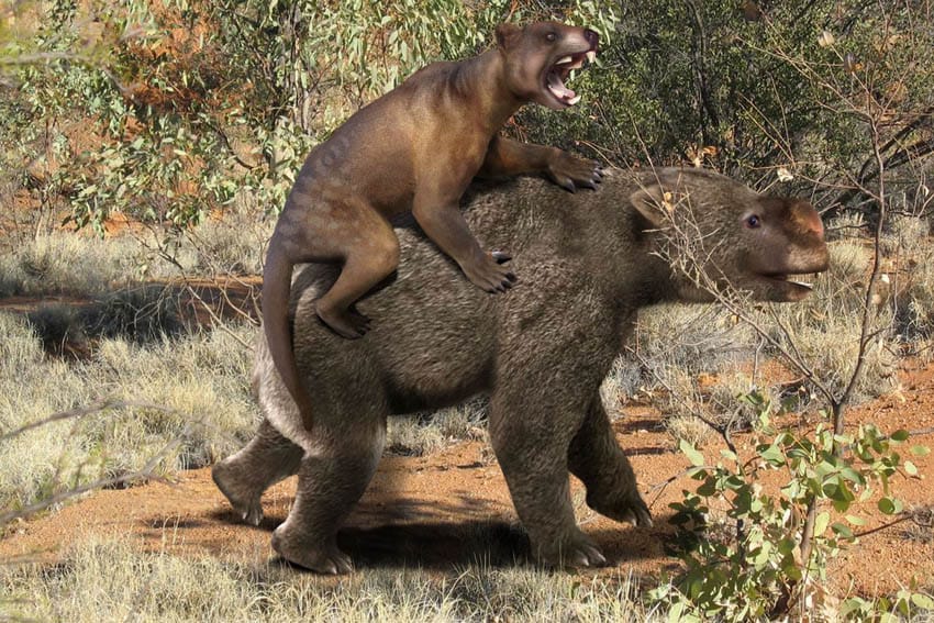 圖為一隻袋獅正在攻擊雙門齒獸的想像圖。袋獅具有優秀的攀爬能力,說不定牠就是澳洲人口中真正的「掉落的熊」。