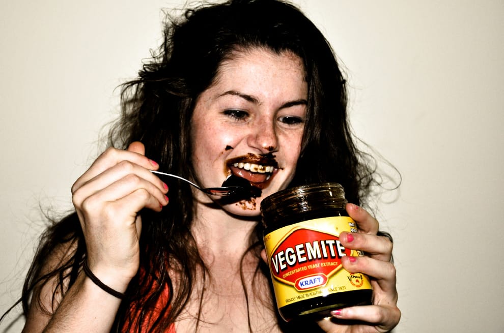 一名女子正在大啖澳洲國民食品維吉麥發酵醬。想要避免遭到「掉落的熊」攻擊,或許可以試試看把臉塗上維吉麥發酵醬。