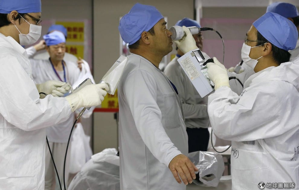 照片中是日本福島第一核電廠的人員他們正在檢查身上的放射線量