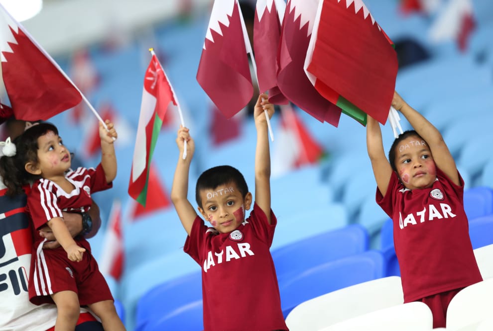 2019年10月,在卡達的沃克拉(Al-Wakrah)體育館內,孩子們身穿卡達國家足球隊的球衣、拿著卡達和阿曼的國旗為兩隊加油。