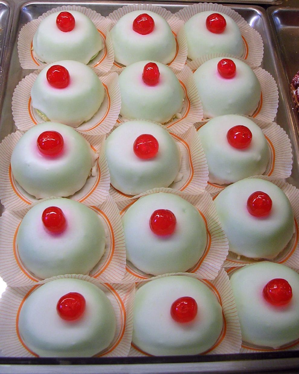 而義大利西西里島甜點「聖阿加莎的咪咪」(Minne Di Sant'Agata)也是一種外型長得像胸部的半圓形糕點,上面淋滿白色的糖霜,最後放上一顆糖漬紅色櫻桃做點綴,象徵羅馬時代烈士聖阿加莎(St Agatha)的胸部。當時,聖阿加莎全身心奉獻給天主教會,拒絕了男人的求婚而因此遭到切開乳房的酷刑。