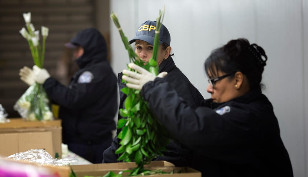 英國脫歐後,很多身為歐盟會員國時期的待遇也都被一併取消。圖為 2014年1月9日這天,美國海關及邊境保衛局(U.S. Customs and Border Protection)的官員正在邁阿密國際機場(Miami International Airport)裡,檢查一束束預計於情人節期間販售的花朵。