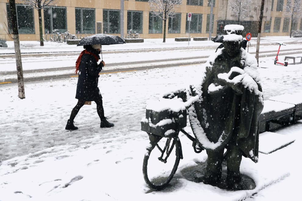 在瑞士,一名女子走過佈滿一地積雪的街道。