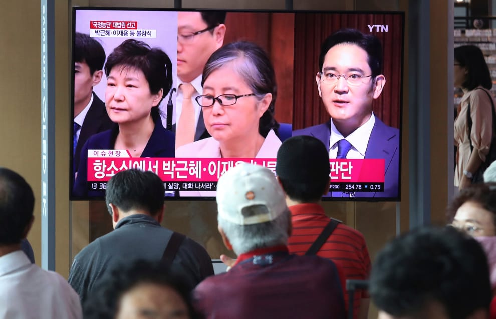 2019年8月,首爾地鐵站的電視正在播放南韓前總統朴槿惠(左)、密友崔順實(中)和三星集團繼承人李在鎔(右)的貪汙和行賄新聞。