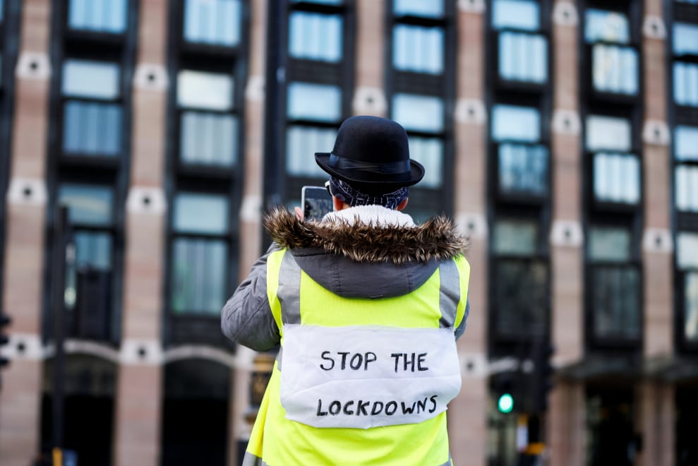 在封鎖期間,無法來去自如的人們心理健康變得很糟糕,有的民眾索性違反防疫規範,上街抗議政府的封鎖規定。圖為一名在倫敦抗議當局封鎖規定的民眾,他的背心上貼著「停止封鎖」的標語。