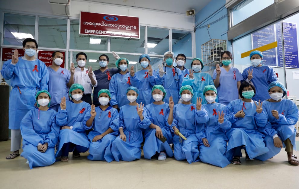 雖然沒有大規模的街頭示威,但緬甸民眾仍然透過其他方式,表達他們對軍政府的反對,像是圖中緬甸仰光總醫院(Yangon General Hospital)急診室的醫護人員們,便在胸口繫上紅絲帶,並一同比出三指朝天的手勢,表達他們對軍方政變一舉的不滿。