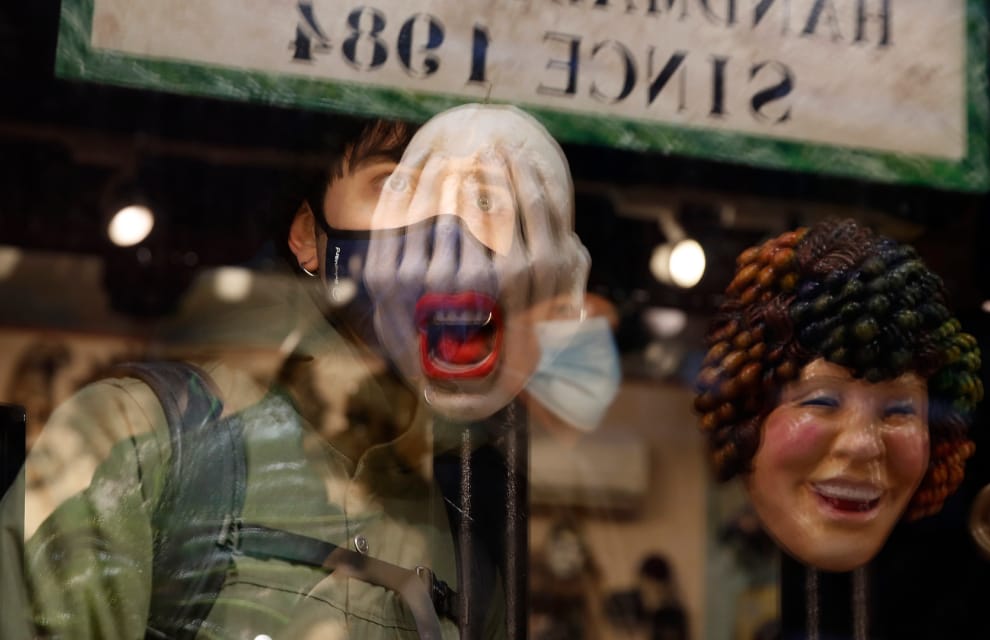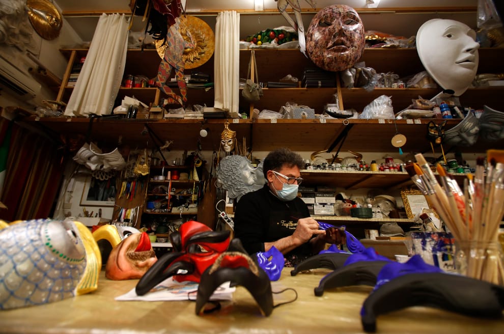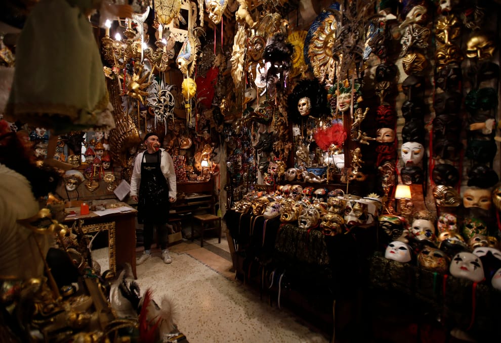戴著口罩的店員站在威尼斯的面具店Tragicomico裡,看著掛滿天花板和牆面的面具們。